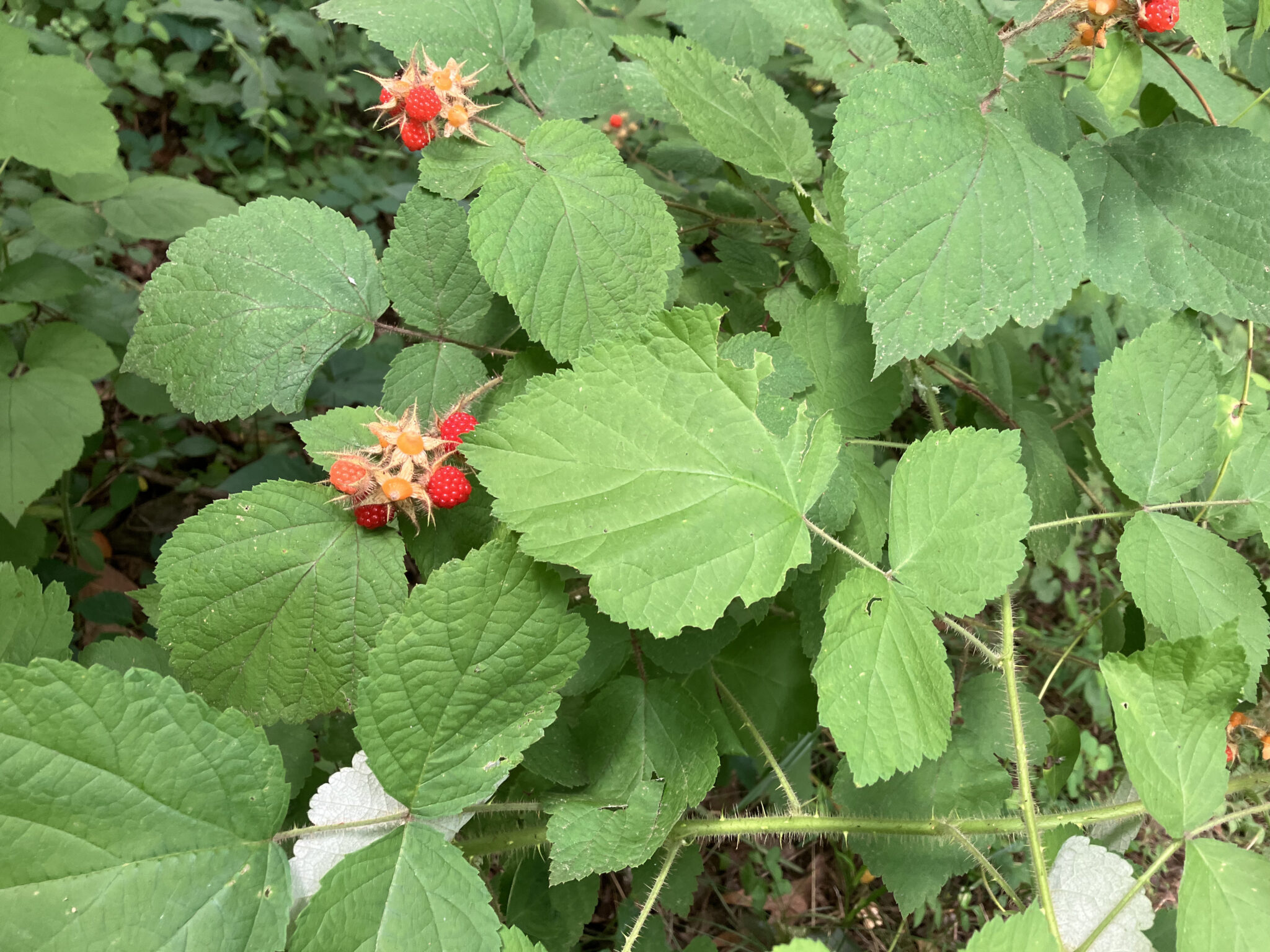 A wineberry plant, note the placement of the fruits, the shape of the leaves, and the thorniness of the branches.