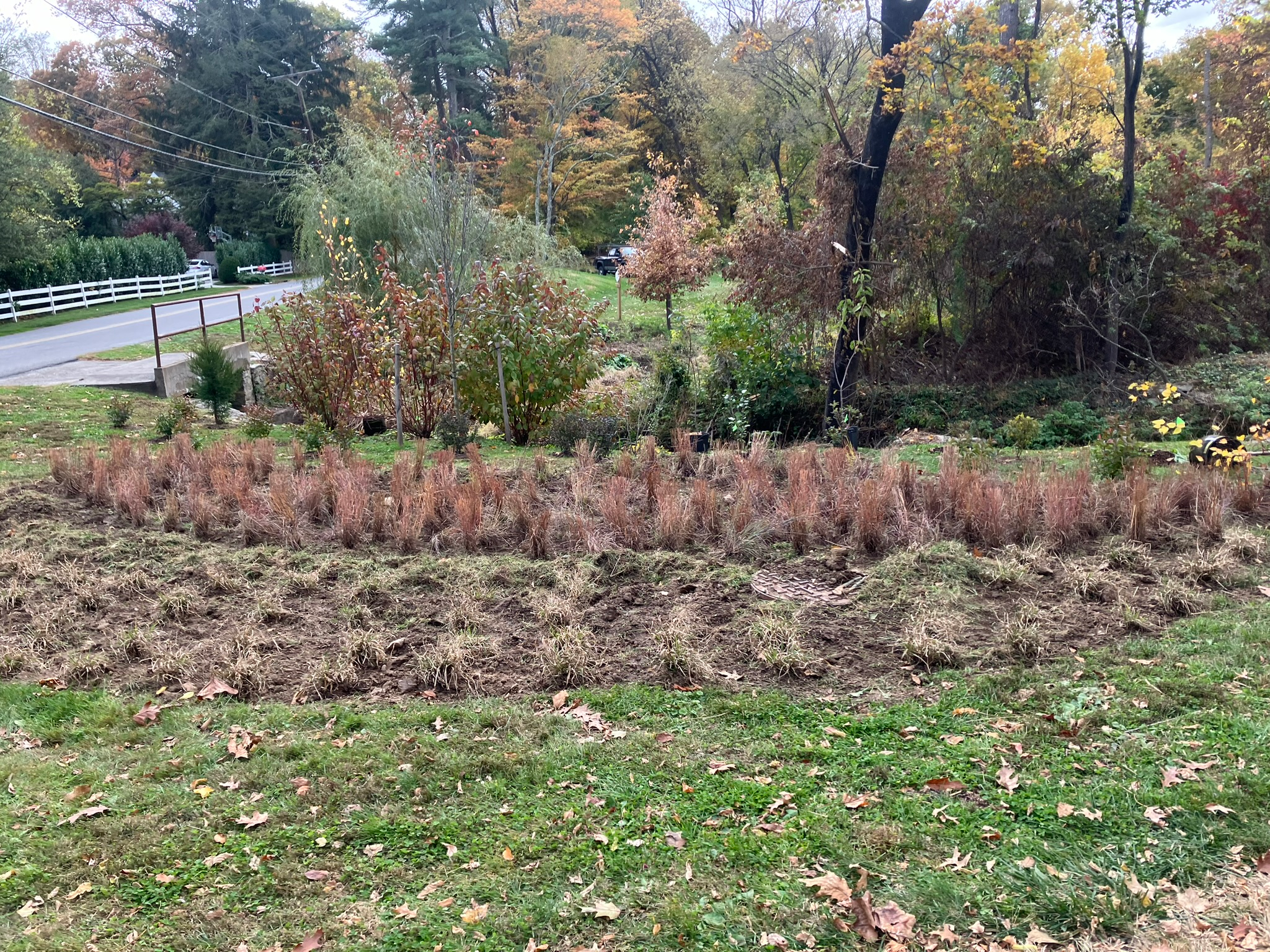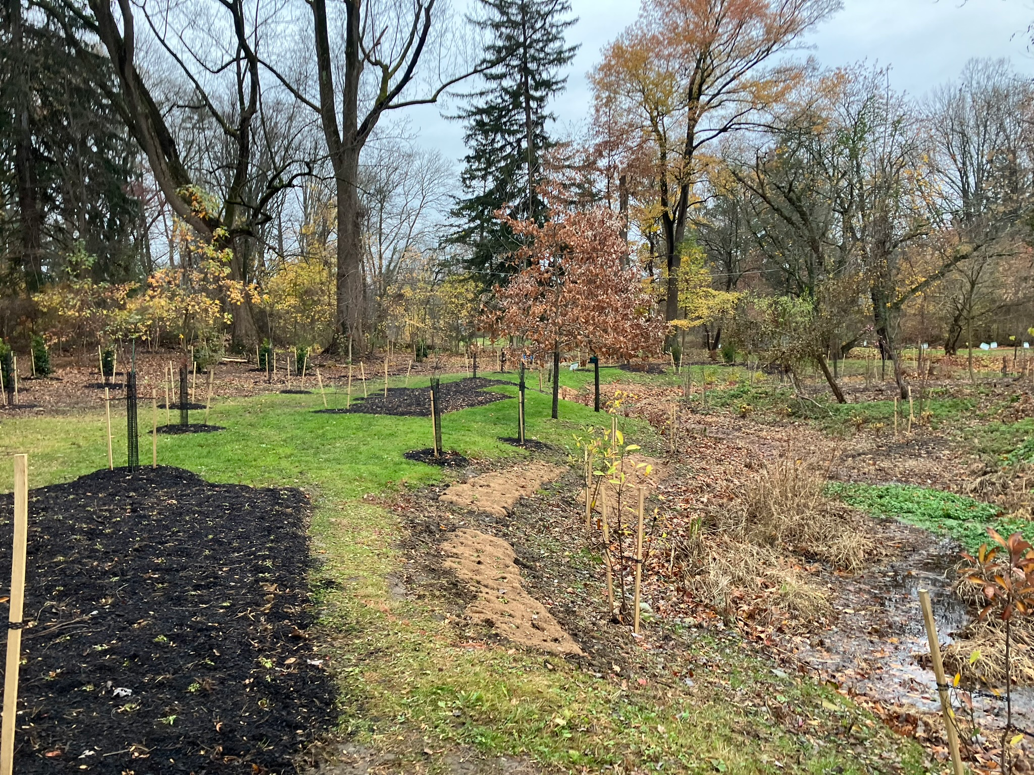 The south side of the stream, where invasive plants have been weakened already, was planted in October. Gray Landscape Design, LLC created the planting plan and guided the implementation. The plan emphasizes native trees and shrubs, to compete with and eventually shade out the invasive plants. There are a few clusters of hardy perennials intermixed, planted in coir matting to create an advantage.