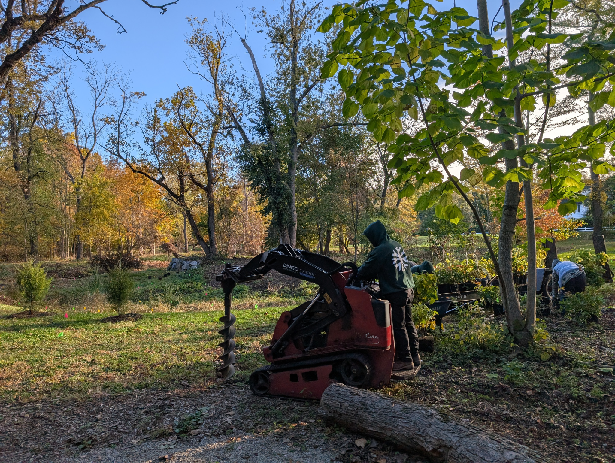 We are cutting the porcelain berry, Japanese knotweed, and multiflora rose plants growing near the stream near the stream for two growing seasons to counter their spread. Goats from Amazing Grazing ate some of thickest patches of invasives to start the process. The Growing Network has cut down other areas near the stream. They use a machine that can destroy tough plants while maintaining enough maneuverability to avoid native plants growing in the space. The Growing Network returned in September to knock the invasives back again.